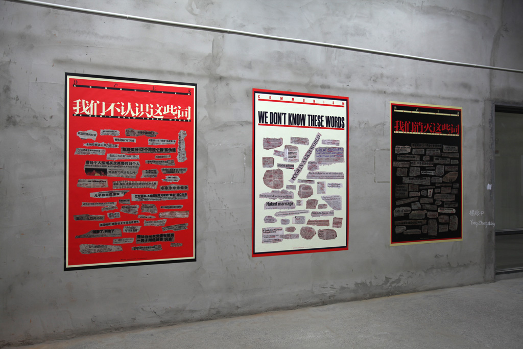 这3件”海报”作品是大量当月报纸信息的拼贴,很多关键字眼用红笔圈记出来。海报的标语分别是:“我们消灭这些词”、“我们不认识这些词”。如果我们被灌输的概念中的共产主义实现了,这些被圈中的概念我们就不应该认识或者不应该存在。