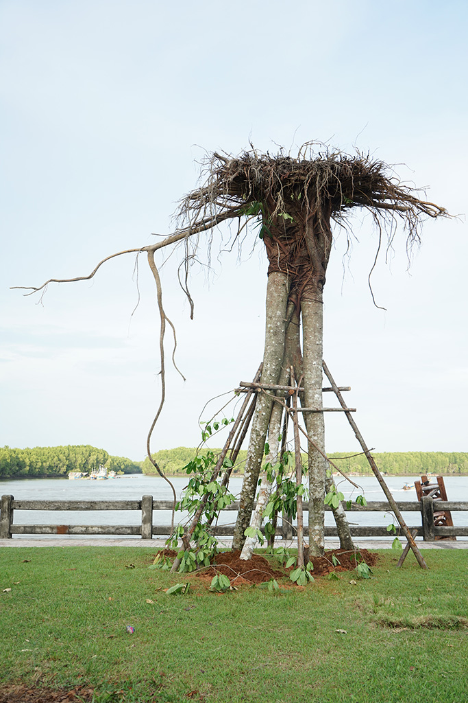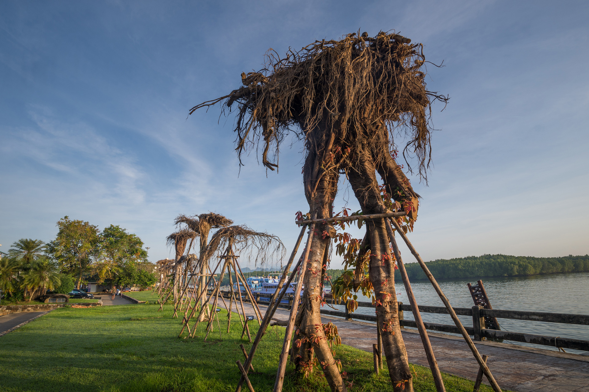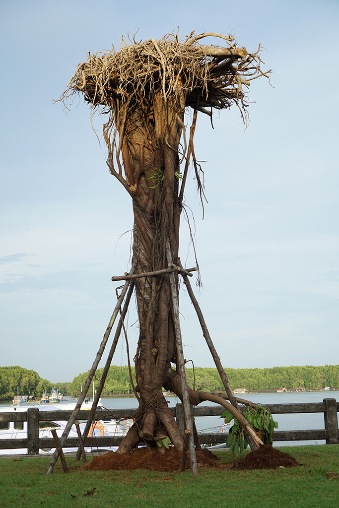 Thailand Biennale 2018, in Krabi, Thailand. Yang Zhenzhong picked 10 banyan trees in the area, all dug up intact with their roots, and then planted them upside down with their crowns back in the ground.
