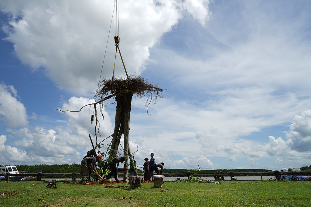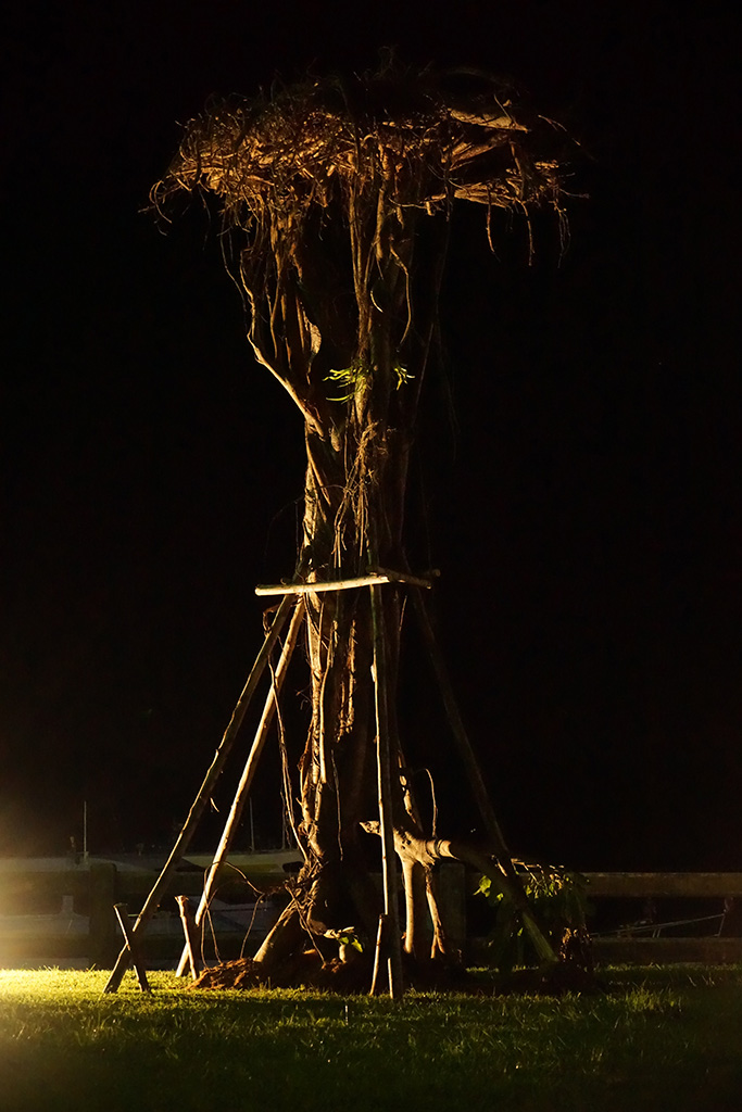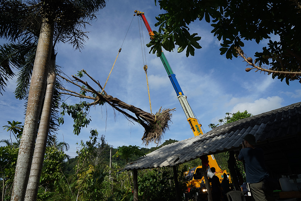 2018年泰国双年展,在泰国甲米。杨振中在当地挑了10棵榕树,都完整地连根挖起,然后将它们倒立,树冠种回地里。