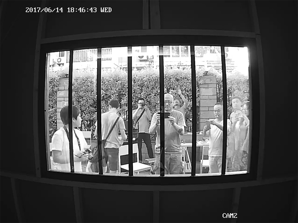 2017.6.14至9.11在北京箭厂空间的“栅栏”装置作品中的监控设备录制的三个月视频内容,分成12个监视屏幕展示。