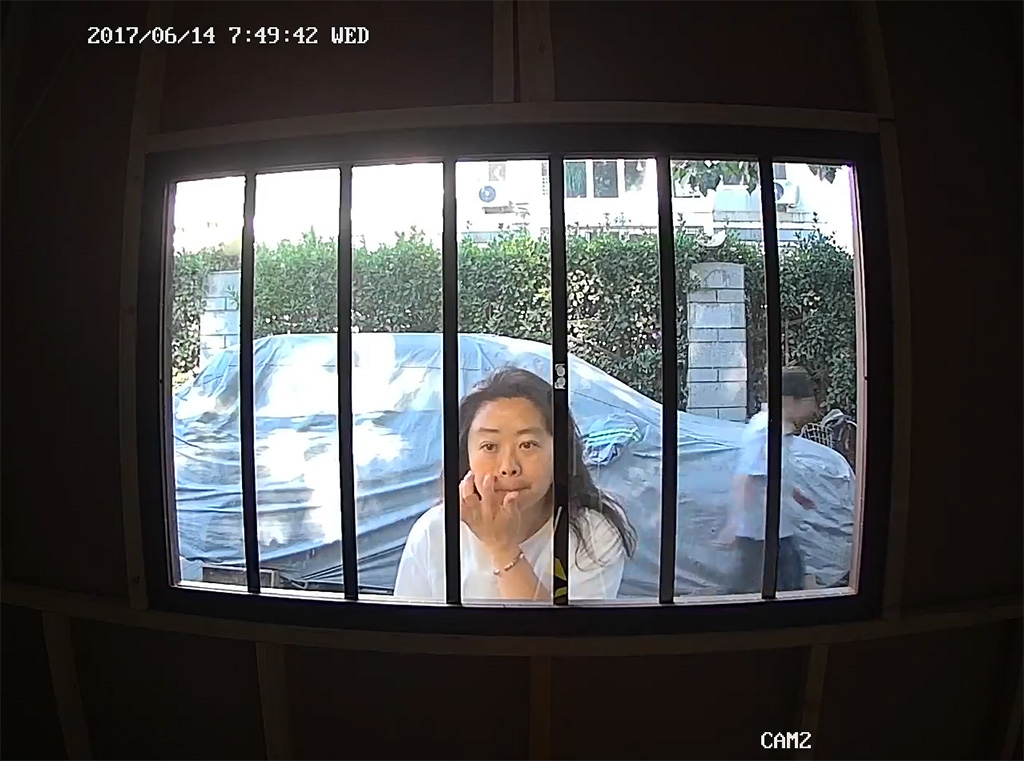 The video content recorded by the surveillance equipment in the installation "Fence" at Arrow Factory Space in Beijing from 14.6.2017 to 11.9.2017 was divided into 12 surveillance screens for display.