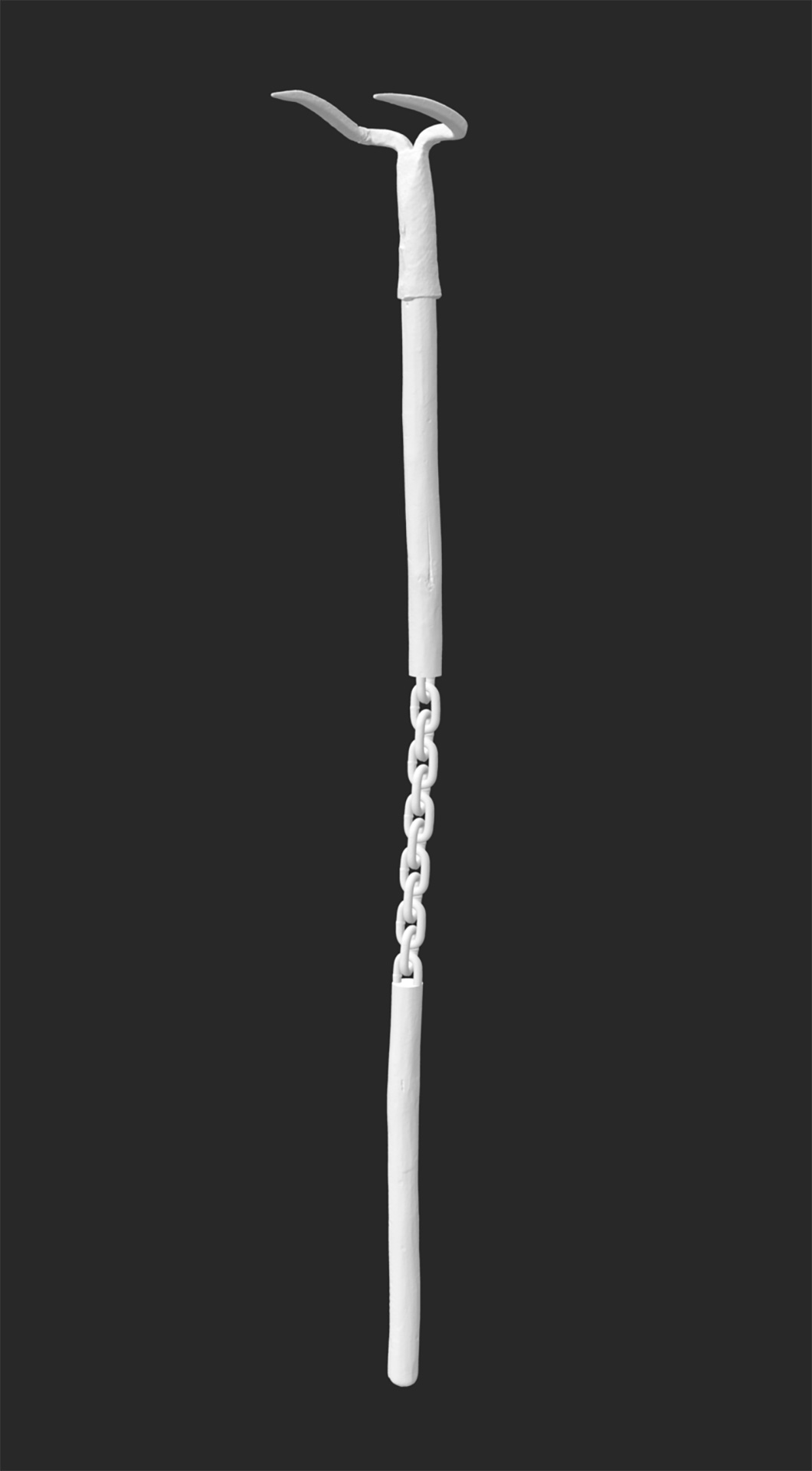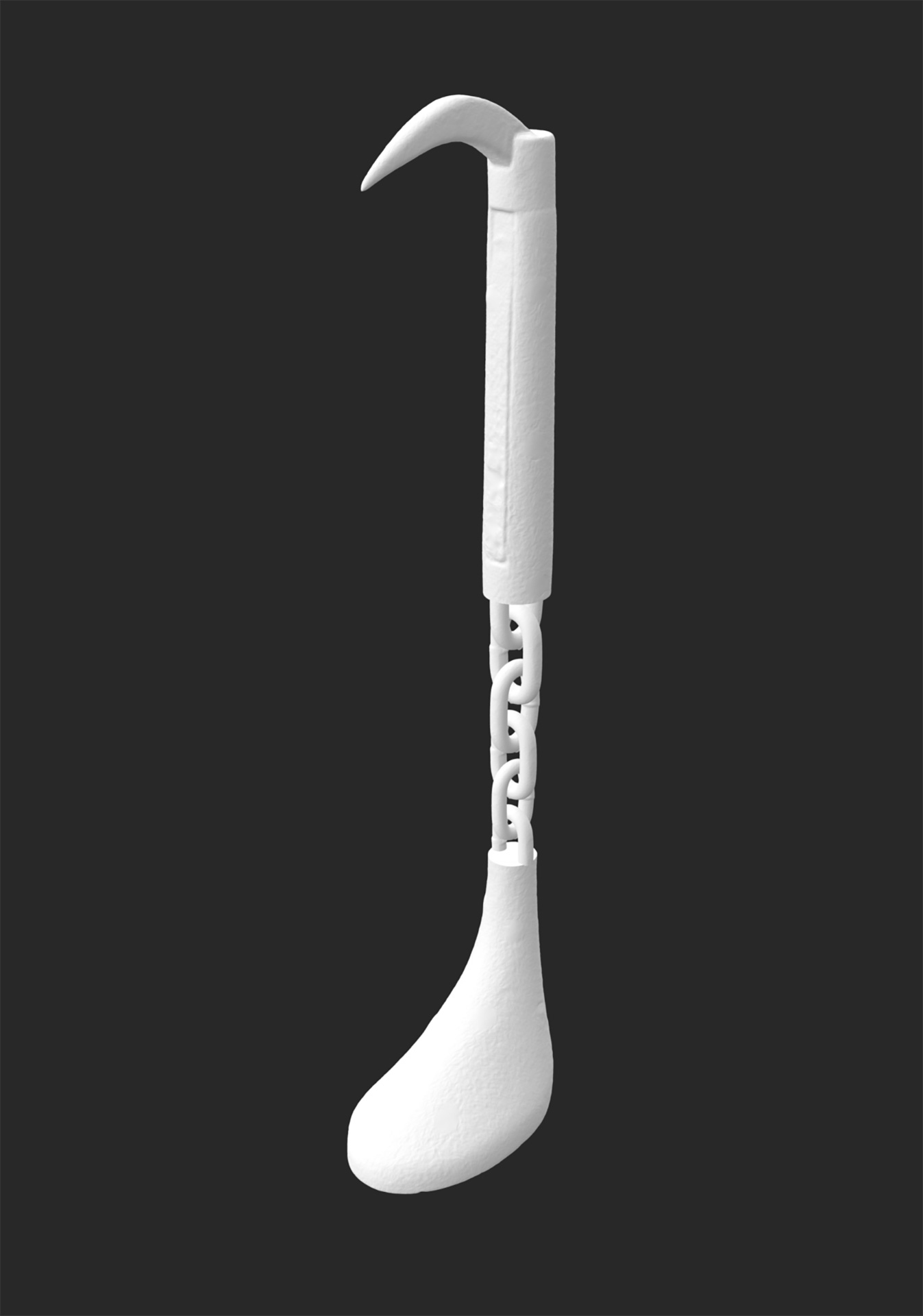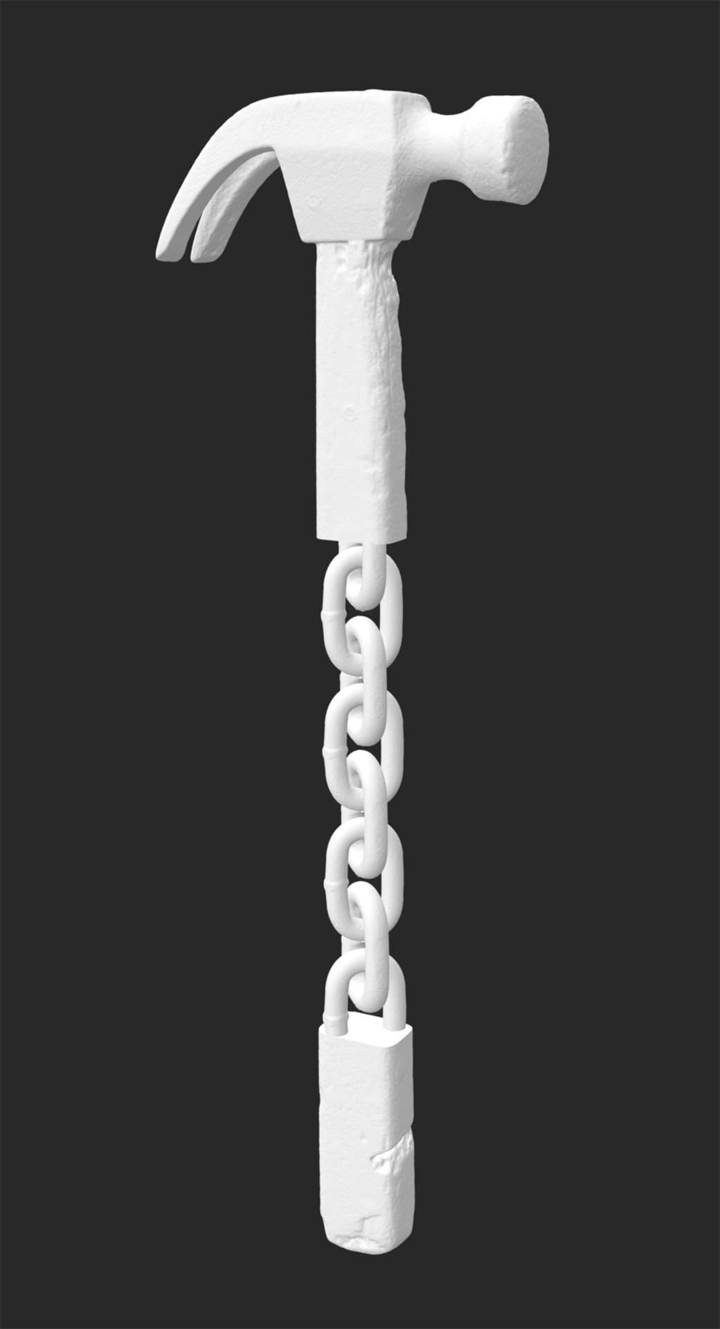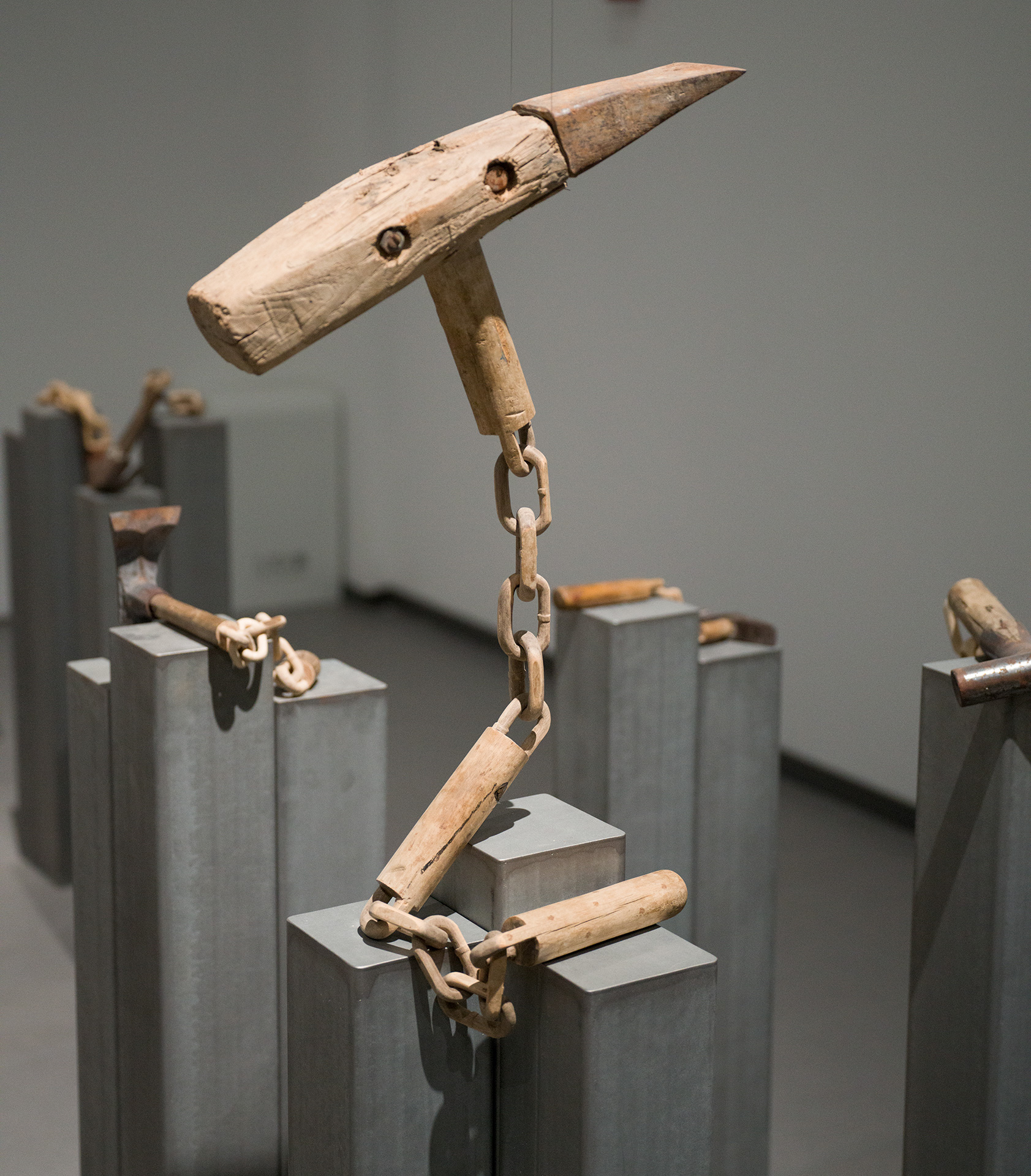 艺术家收集各种被使用过的手工工具,首先3D扫描每一件工具,并用3D软件把木质部分套入链条的形状。通过3D雕刻定位,最后在浙江东阳木雕工作坊,用传统的镂空雕工艺雕刻成形。The artist collects various used hand tools, first conducting 3D scanning of each implement. Using 3D software, the wooden components are modeled into chain-like forms. Through precise 3D engraving positioning, the final pieces are carved using traditional hollow-carving techniques at the Dongyang Woodcarving Workshop in Zhejiang Province.