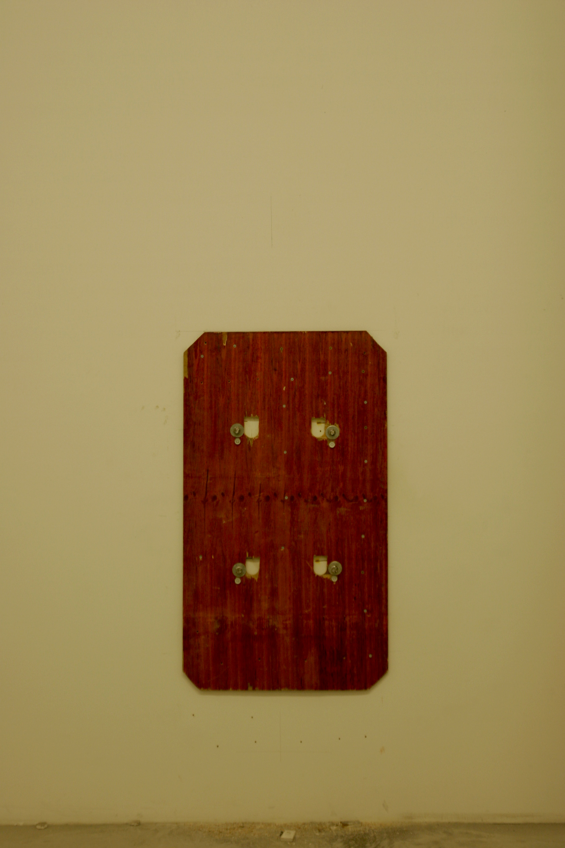This video shows a close-up of plaster being torn off hairy skin. As the scene repeats, the color gradually shifts through the entire color spectrum. Shown with the video installation on a table are before and after photos of the skin and the used piece of plaster itself.